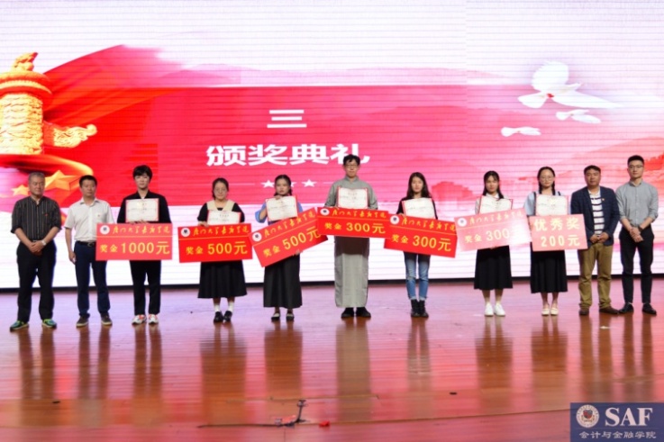 经过激烈的角逐,本次比赛最终由会计学学生党支部&20会计5班团支部摘得桂冠;会计学学生党支部&19会计4班团支部和会计学学生党支部&20会计4班团支部荣获二等奖;金融学学生党支部&20金融3班团支部、财务管理学生党支部&20财管1班团支部和财税学学生党支部&19财政1班团支部荣获三等奖,金融学学生党支部&20金融1班团支部荣获优秀奖。随后由开发区公用事业公司副总经理高向东、龙海移动公司总经理王健、聚英教育集团闽南考研副校长夏一方、会计与金融学院党总支书记甘友成为参赛队伍颁奖并进行合影留念。