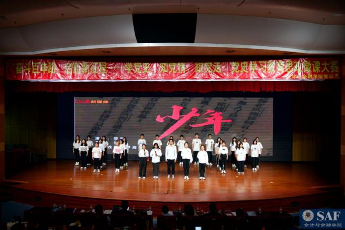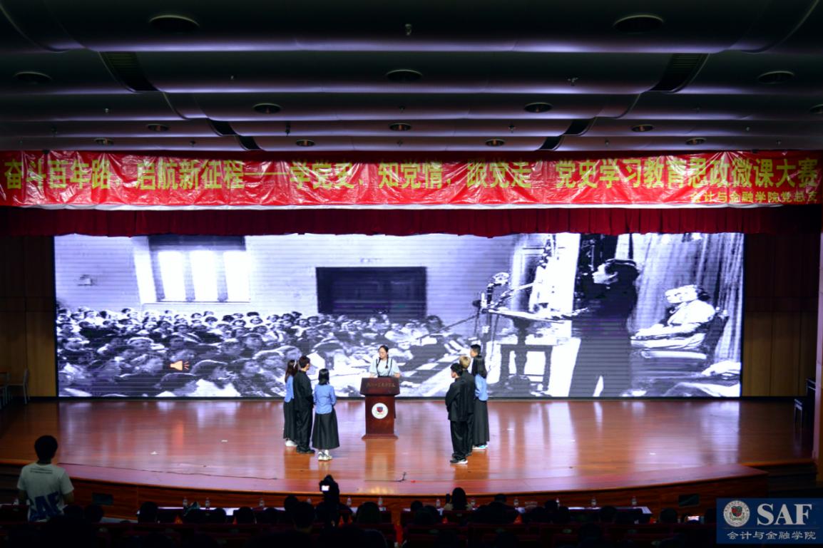 比赛初始,在主持人马朔简短的开场白后,决赛拉开了帷幕。来自会计与金融学院各专业的七支学生党支部和团支部联合队伍分别以朗诵、话剧、歌舞表演等形式为在场观众带来了生动的思政微课展示。