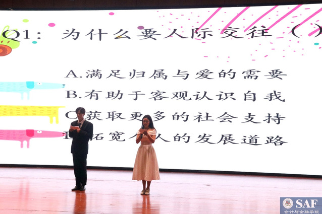 其次则是王老师为同学们答疑解惑的时刻,大会开始前工作人员收集现场观众在人际交往中遇到的问题,王老师在台上一一为同学们耐心解答并提出自己的见解与建议,引导同学正确处理目前所遇到的相关人际交往的问题。