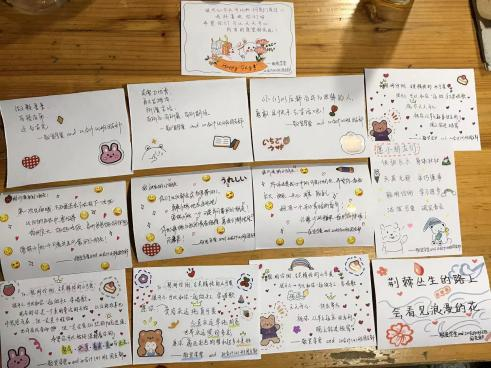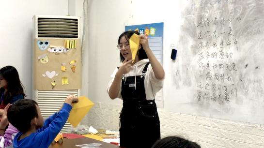 接着由占蕾同学向小朋友们教授爱心的折法,在黄子程、陈灿荣、王育天、何昕颖同学以及敬贤学堂志愿者的帮助下顺利完成了教学任务。随后,王育天同学让小朋友们将想对父母说的话写在爱心上,以此寄托感恩之情。