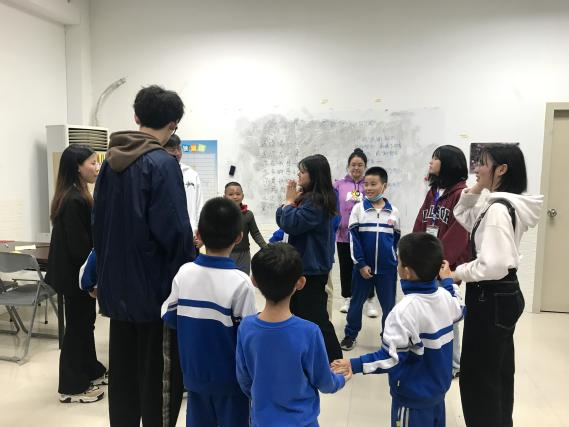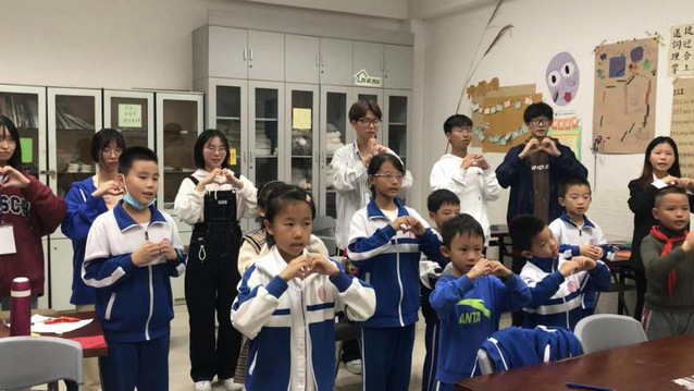 紧接着,由王育天同学带领小朋友们学习了《听我说谢谢你》手势舞。王育天同学绘声绘色的教学引起了小朋友们的兴趣,学习的热情使课堂氛围达到了高潮。学习完毕后,2020级会计(4)班的志愿者带领小朋友们一起进行了手势舞表演。