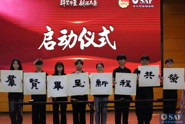 宣誓结束,会计与金融学院(SAF)团委副书记陈亚鹏老师和各团学组织负责人代表上台进行新一届团学组织的启动仪式。墨香氤氲间,陈亚鹏老师与各团学组织负责人代表举起手中“群贤毕至·新程共荣”八个大字,会计与金融学院(SAF)第十届团学组织正式成立。