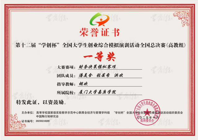 第十二届“学创杯”全国大学生创业综合模拟演训活动全国总决赛圆满落幕。我校会计与金融学院学子在比赛中表现卓越,由胡欢老师指导,潘美含、张芸希、洪欢同学组成的参赛团队在“财务决策模拟赛项”凭借出色的综合能力与稳定的临场发挥,荣获全国一等奖;同时,由包华瑜老师指导,杨奕欣、徐绮琪、肖雨珊同学组成的另一支团队在“财务决策模拟赛项”同样表现不俗,荣获全国二等奖,充分展现了我校在创新创业教育与实践育人方面的扎实成效。