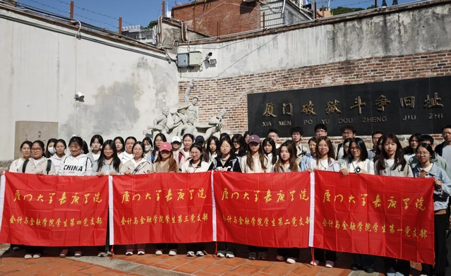 为深入学习弘扬红色文化精神,铭记革命历史、传承爱国基因,进一步强化党支部的凝聚力与战斗力,厦门大学嘉庚学院会计与金融学院四个学生党支部于2025年11月22日共同开展“赓续红色薪火,砥砺时代新程”主题党日活动。本次活动由学生第二党支部书记罗欢、第三党支部书记龚学峰、第四党支部书记郑永方共同带队,各支部成员循着红色足迹开展实地研学,先后探访厦门大学陈嘉庚纪念馆、校史馆,走进厦门破狱斗争旧址,在红色印记与校史文脉中感悟初心使命、汲取奋进力量。