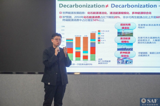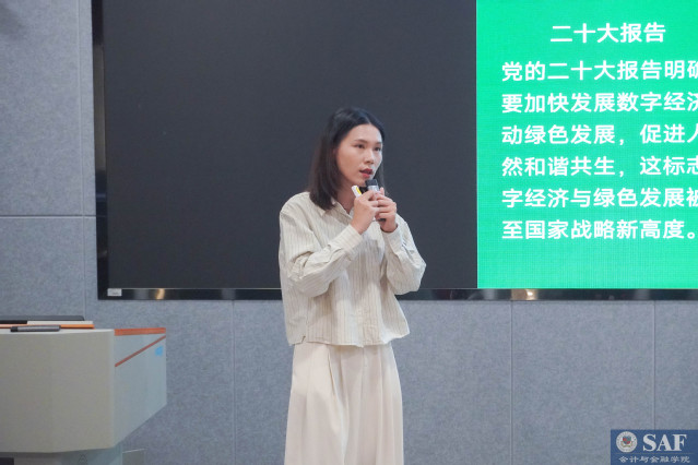 第二位报告者是会计与金融学院的葛泽文老师,他作了题为“BuildingLess to Achieve More: A Degrowth Pathway in Global Net-Zero Energy Transitions”的报告。葛老师在论文中阐述了自己的主要观点:即为了将全球变暖控制在《巴黎协定》所确定的温度目标范围内,世界必须通过加速从以化石燃料为主导的传统能源体系向以可再生能源为中心的现代能源体系的转变,来实现所有领域的快速去碳化。这一转型受到了多种因素的制约。葛老师分析了制约的核心原因,并提出了应对思路。本篇报告的点评嘉宾是来自厦门大学财务管理与会计研究院的侯芳芳老师,她首先肯定了葛老师的研究成果,并详细解读了葛老师的研究结论,为葛老师就相关问题深入研究提供了很多高质量的参考文献和富有建设性的意见。