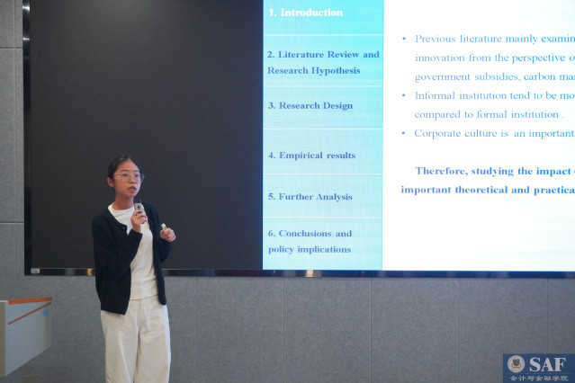 第三位报告者是来自会计与金融学院的曾艳琪老师,她作了题为“CanCorporate Culture Promote Chinese Corporate Green Innovation? New Evidencebased on TanhGAT-Tabnet Model”的报告。曾老师在报告中指出:企业文化对创新的影响是非线性的,并与其他因素相互作用。其在论文中创新性地引入 TanhGAT-Tabnet 模型,探讨企业文化对绿色创新的直接与间接影响。侯芳芳老师作为点评嘉宾,充分肯定了本文使用的实证研究方法,特别提到论文中模型使用得恰到好处。另外,来自厦门理工学院的林哲老师建议对企业文化进行具体分解,以便更好地区分各类因素对企业绿色创新的贡献度。