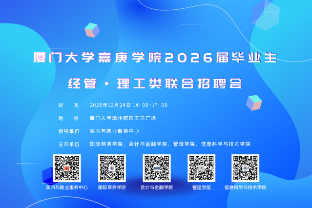 还在为求职迷茫?还在为简历优化发愁?12 月 24 日下午,厦门大学嘉庚学院 2026 届毕业生经管・理工类联合招聘会即将重磅启幕!由国际商务学院、会计与金融学院、管理学院、信息科学与技术学院联合主办,近 40 家优质企业组团进校,海量热门岗位 + 贴心简历门诊同步上线,2026 届毕业生速来解锁求职新通道!